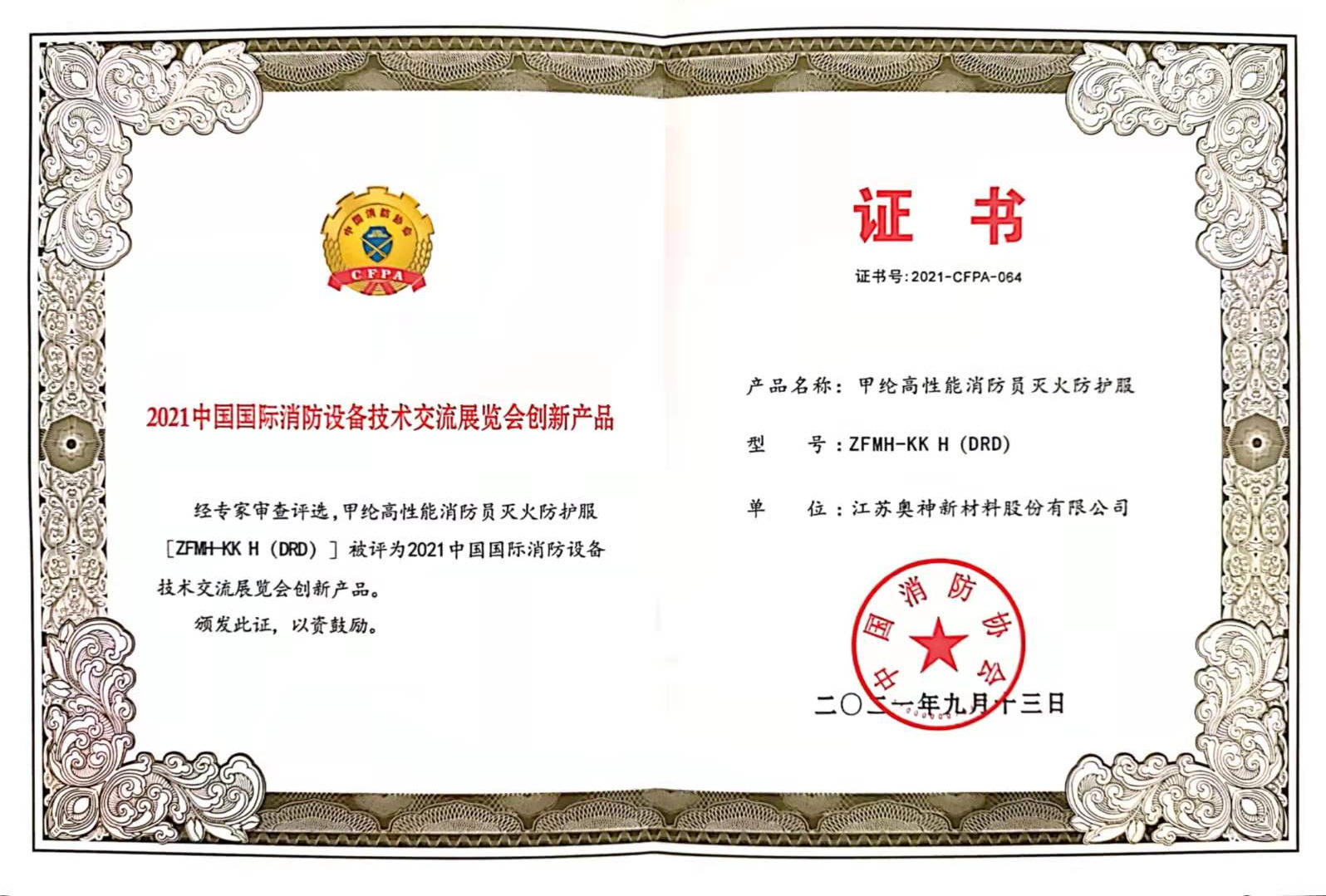 2021年10月12日,在北京召開的第十九屆中國國際消防設備技術交流展覽會上,江蘇奧神新材料股份有限公司研發(fā)的“甲綸高性能消防員滅火防護服”憑借優(yōu)異的性能獲得“2021中國國際消防設備技術交流展覽會創(chuàng)新產(chǎn)品”榮譽稱號。此次參與評選的都是來自全國各地實力雄厚的消防領域企業(yè),經(jīng)歷層層評選,甲綸高性能消防員滅火防護服脫穎而出,受到專家的一致好評。