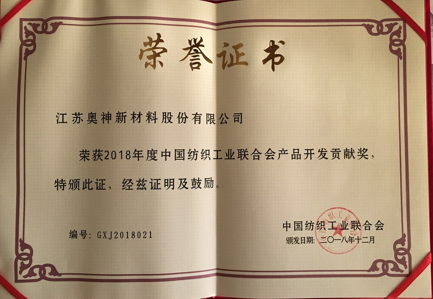近日,在北京召開(kāi)的2018年中國(guó)紡織創(chuàng)新年會(huì)上,江蘇奧神新材料股份有限公司獲得中國(guó)紡織工業(yè)聯(lián)合會(huì)頒發(fā)的“2018年度中國(guó)紡織工業(yè)聯(lián)合會(huì)產(chǎn)品開(kāi)發(fā)貢獻(xiàn)獎(jiǎng)”榮譽(yù)稱(chēng)號(hào)。