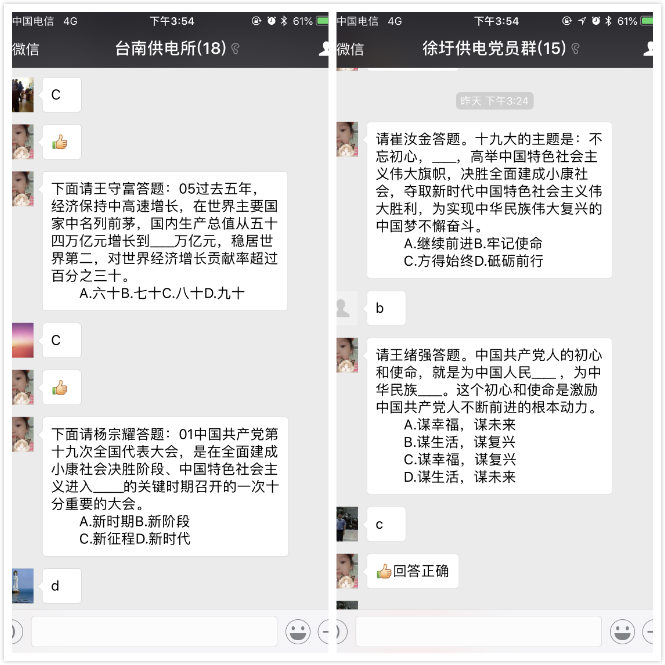 本次考試采用微信答題的方式,由黨群人員先在微信群里清點(diǎn)黨員人數(shù),隨后每人回答指定問題,確保測試范圍覆蓋全體黨員。微信考試的方式,解決了黨員學(xué)習(xí)時(shí)間上、空間上的難題,具有很大的便利性和可操作性。(電宣)