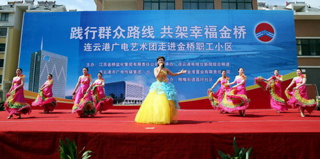 為了貫徹黨的群眾路線教育實(shí)踐活動(dòng)精神,豐富基層職工的精神文化生活。6月28日上午,由連云港廣電傳媒集團(tuán)和集團(tuán)公司共同主辦的“踐行群眾路線,共架幸福金橋”連云港廣電藝術(shù)團(tuán)走進(jìn)鹽場職工小區(qū)文藝演出在猴嘴昌圩湖社區(qū)拉開帷幕。廣電傳媒集團(tuán)領(lǐng)導(dǎo)戴詠寒、馬富勝、萬自力,集團(tuán)公司領(lǐng)導(dǎo)顧永庚、鄭宜虎、戴鴻鳴與數(shù)百名鹽場職工群眾歡聚昌圩,共同欣賞來自連云港廣電新聞綜合頻道的主持人和編輯記者與金橋職工自編自演的精彩節(jié)目。