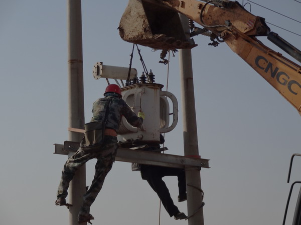 圖為線路工正在安裝變壓器 4月25日,灌西供電所積極做好灌西鹽場投資公司800畝改造好的農(nóng)田灌溉用電服務。 灌西鹽場投資公司800畝漁塘改造成農(nóng)田工程已經(jīng)完工,急需用電打淡水進行灌溉。該所為不影響農(nóng)田灌溉,減化用電手續(xù),迅速準備材料,組織人員以最快的速度立桿,并架設一臺80KVA變壓器,整個施工過程僅用半天時間,就安全供電,并優(yōu)先保證供電。(王志勇)