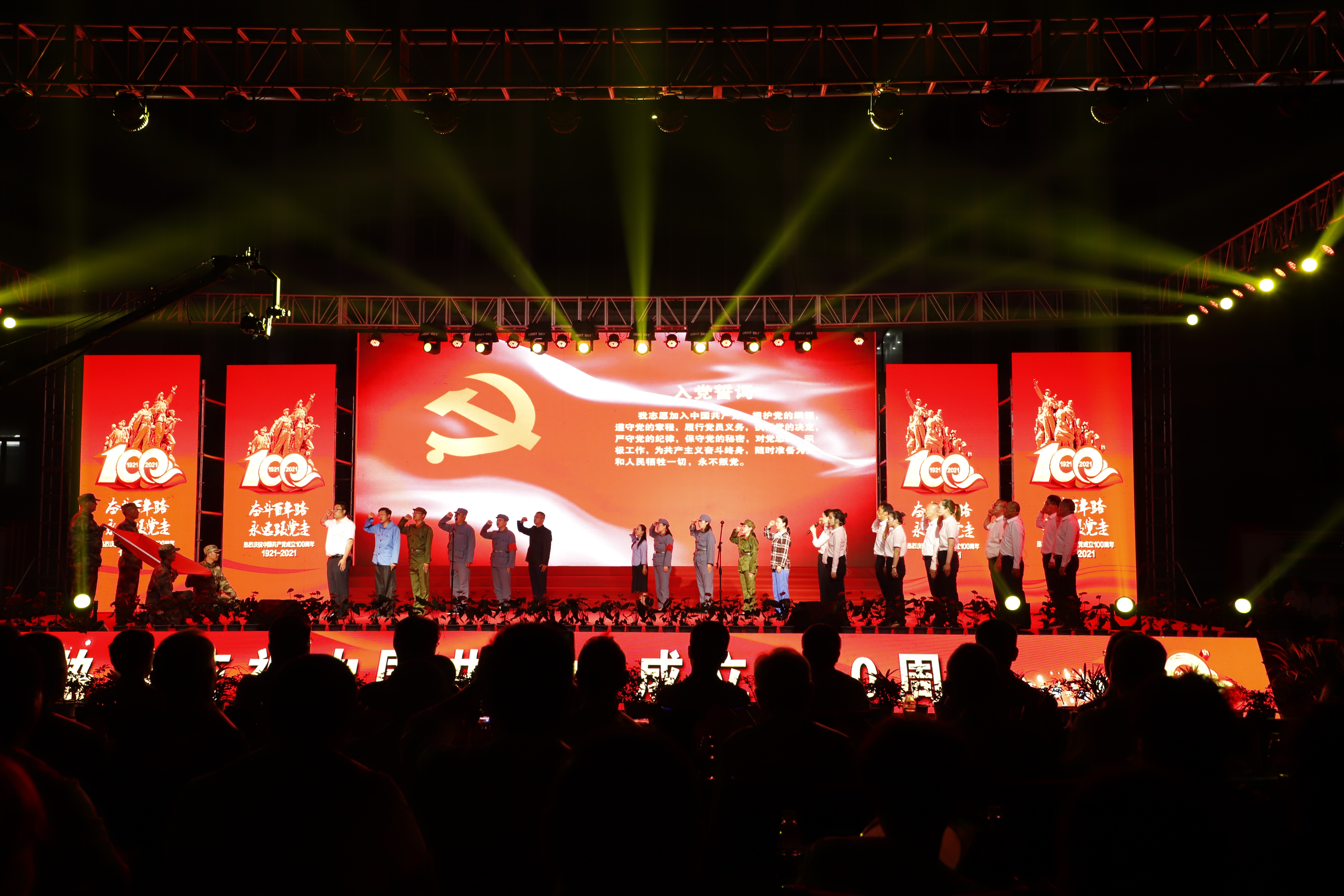 百年征程路漫漫,燦爛輝煌激人心,是中國共產(chǎn)黨指給了人民解放的道路,領導中國走向光明,是中國共產(chǎn)黨引領中華民族走向復興之路,奮進新時代、開啟新征程,最后,全場人員同唱《沒有共產(chǎn)黨就沒有新中國》,10面國旗、10面黨旗在揮舞,整個舞臺成為一片紅的海洋,整場晚會圓滿落下帷幕。