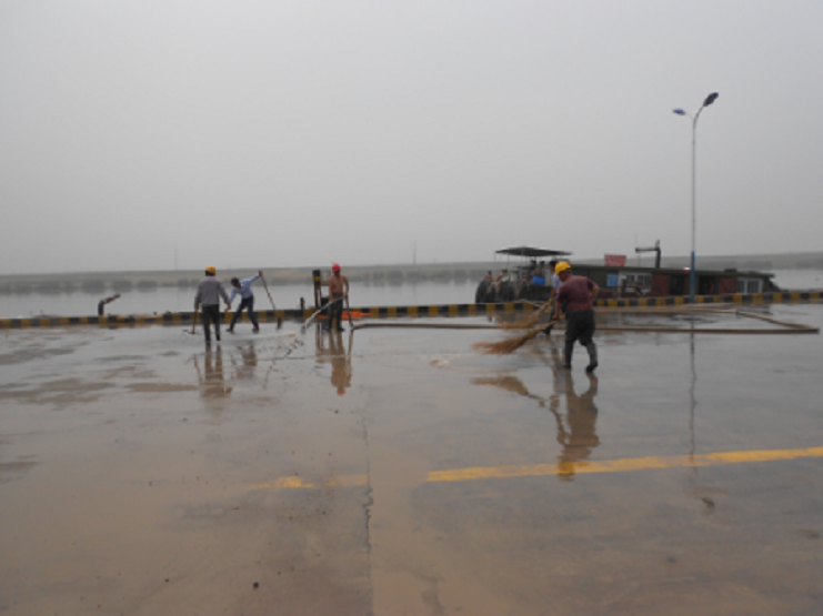 近期由于五灌河水位下降,給停靠碼頭的船只帶來了很大的安全隱患,于是公司決定對碼頭岸線的河道進行一次清淤工作,在清淤的運輸過程中使碼頭作業(yè)區(qū)一片狼跡,為了不影響宏港石化的PPA噸袋的吊裝業(yè)務,6月11日上午公司班子成員主動放棄休息日與上班工人一道對碼頭作業(yè)區(qū)進行清理,他們有的用水槍沖,有的用掃帚掃,經過二個多小時的奮戰(zhàn),作業(yè)區(qū)場地上渙然一新。(宵洋葛高平)