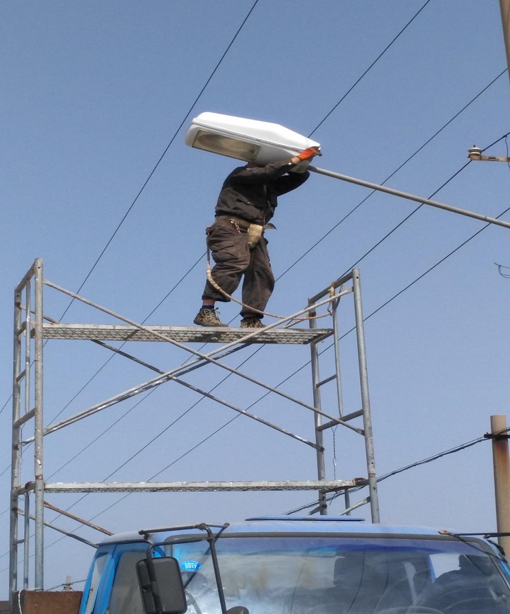 為保證日曬鹽公司職工夜間上班安全,機電服務(wù)公司接到任務(wù)后,及時組織技術(shù)人員對道路路燈進行檢查,確定修理方案, 該公司職工能放棄休息日,進行搶修。共更換引線10盞,換燈泡20只。(圖為5月7上午開始修理現(xiàn)場)