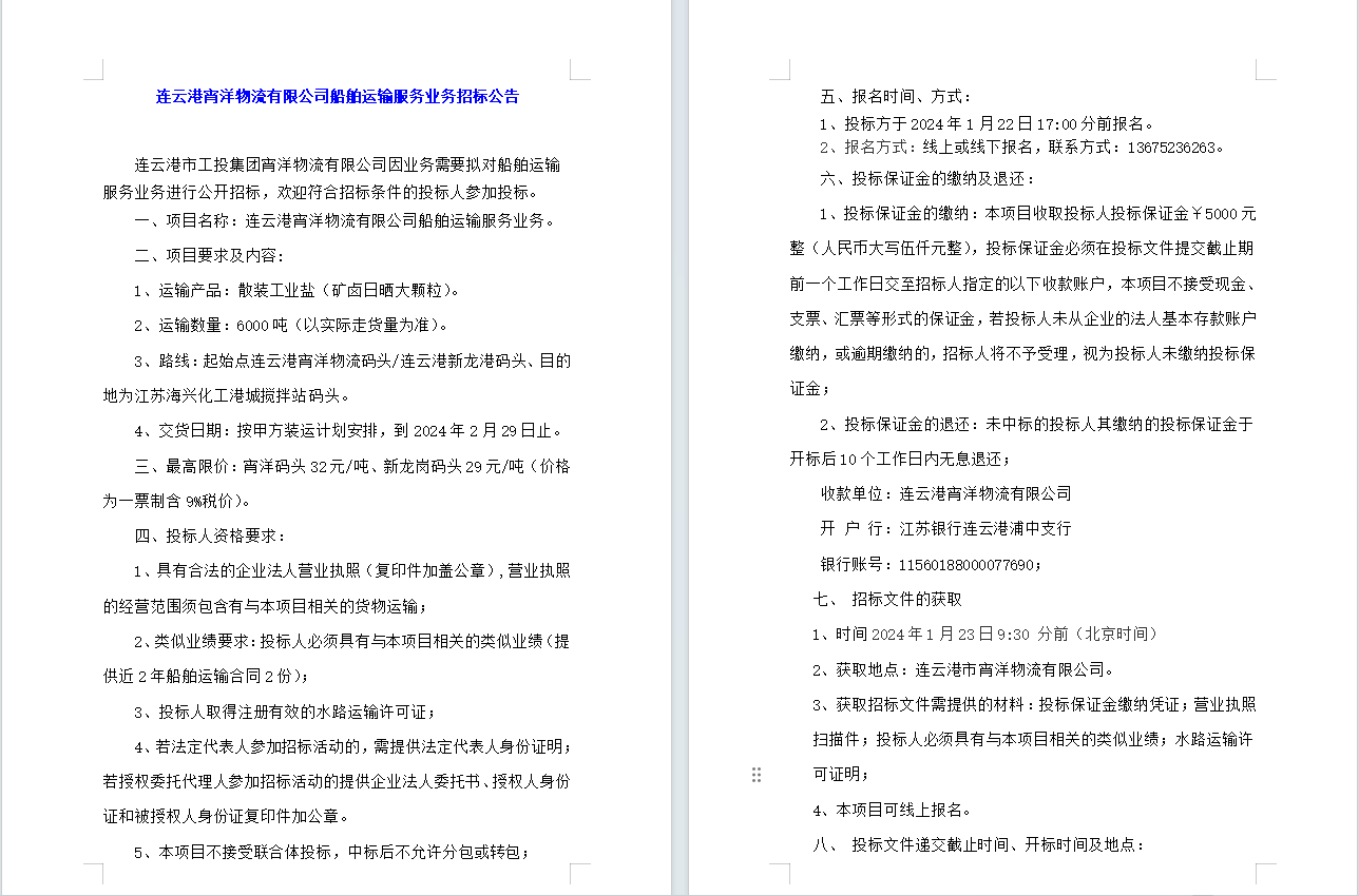 連云港宵洋物流有限公司船舶運輸服務業(yè)務招標公告