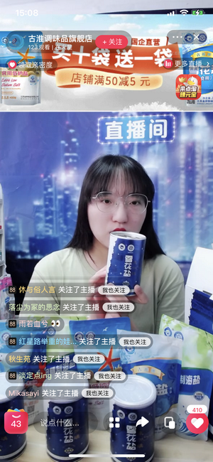 下午3:00,直播正式開(kāi)始。主播通過(guò)網(wǎng)絡(luò)平臺(tái)向粉絲們?cè)诰€介紹了金橋制鹽數(shù)款產(chǎn)品,其中包括雪花鹽、低鈉鹽、日曬海鹽等諸多品種,與粉絲分享淮鹽文化和知識(shí)。在首場(chǎng)直播中,近1000多名粉絲走進(jìn)直播間圍觀、點(diǎn)贊和下單心儀產(chǎn)品。