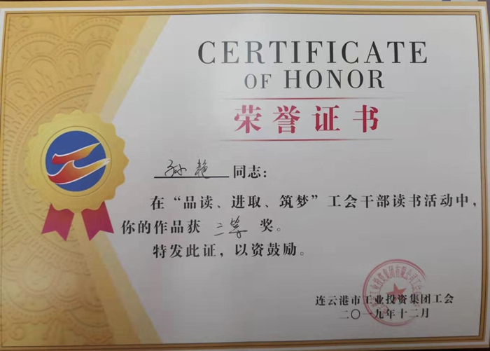 ????在集團(tuán)公司工會(huì)“品讀、進(jìn)取、筑夢(mèng)”主題讀書活動(dòng)中,孫艷同志憑借《光輝的思想 指路的明燈 讀<毛澤東詩(shī)詞全編鑒賞>有感》,獲得三等獎(jiǎng)。