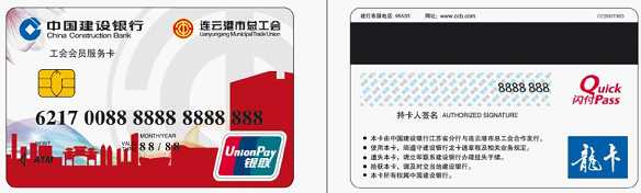 工會會員服務(wù)卡是一張集工會會員身份識別功能、會員服務(wù)功能于一體的工會會員實名服務(wù)卡。具體功能如下: (一)身份識別功能。工會會員服務(wù)卡具有工會會員身份識別功能,記載工會會員基本信息,全市工會會員實名制動態(tài)管理。 (二)工會服務(wù)功能。工會會員服務(wù)卡具有劃入存貯工會所有幫扶救助資金的服務(wù)功能,持卡會員還可免費或優(yōu)惠享受工會組織提供的困難幫扶、職業(yè)介紹、技能培訓(xùn)、心理咨詢、勞動爭議調(diào)解等服務(wù)。 (三)金融服務(wù)功能。工會會員服務(wù)卡具有銀行借記卡的所有功能。 (四)社會服務(wù)功能。工會會員服務(wù)卡整合部分社會服務(wù)功能,通過工會與加盟機(jī)構(gòu)合作,為持卡會員提供醫(yī)療保健、文化娛樂、商業(yè)購物、生活服務(wù)等領(lǐng)域的優(yōu)惠服務(wù)。(具體簽約單位見市總工會網(wǎng)站www.lygzgh.org/ka/) 下圖為工會會員服務(wù)卡卡樣,連云港市總工會發(fā)行的工會會員服務(wù)卡只此一種設(shè)計,請認(rèn)準(zhǔn)連云港市總工會logo和工會會員服務(wù)卡字樣,若同此圖不同均非工會會員服務(wù)卡。