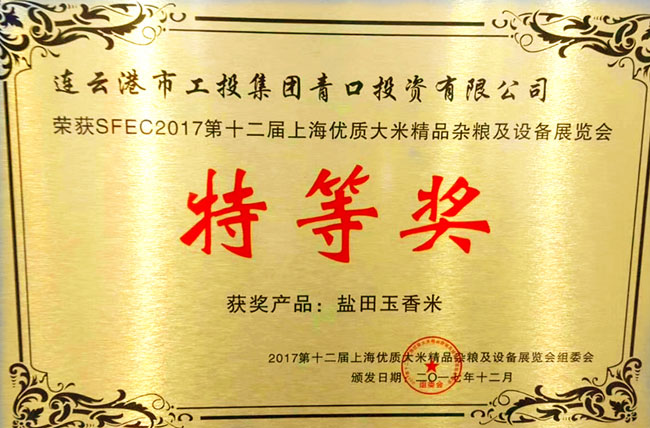 2017第十二屆上海優(yōu)質(zhì)大米及精品雜糧展覽會,我公司“鹽田玉”大米榮獲特等獎,這是繼江蘇好大米稱號之后的又一重大殊榮。
