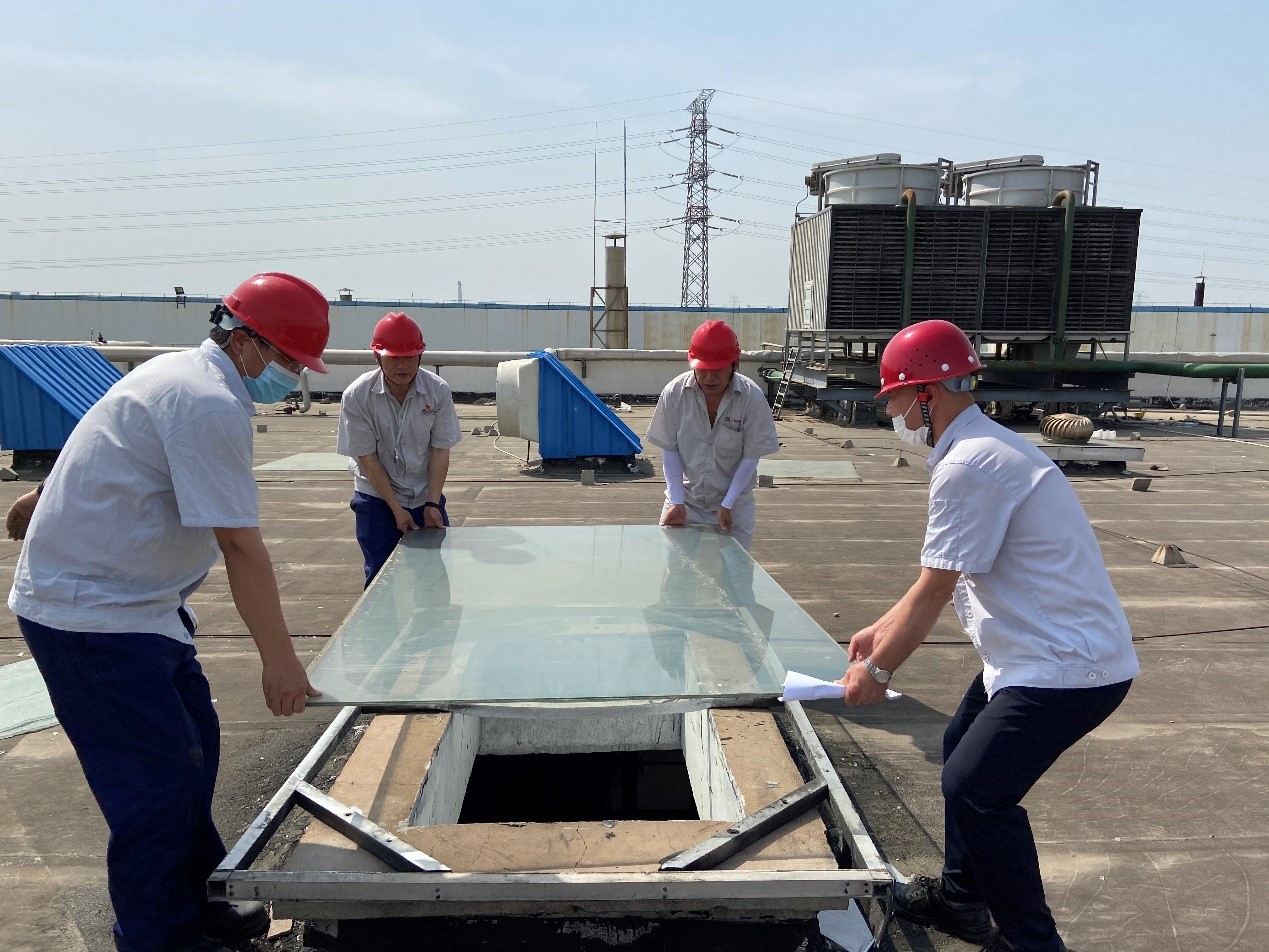 檢查過程中,總經(jīng)理韓立新發(fā)現(xiàn)部分天窗玻璃蓋板有破損,當(dāng)機立斷,頂著炎炎烈日,率先搬起備用玻璃蓋板,動員安委會成員一起更換天窗玻璃蓋板,及時消除安全隱患,筑牢安全防線。艷陽下燙手的玻璃,燙著韓總等安委會成員的手,但溫暖著一線員工的心,切實感受到公司對員工生命安全重視。