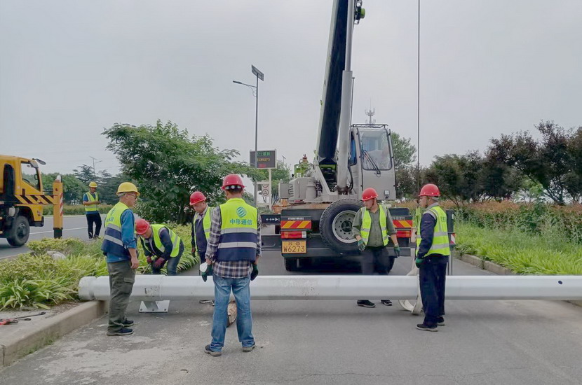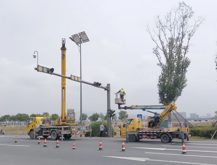 隨后,筆者一行,頂著烈日,驅(qū)車前往翔立分公司市政工程現(xiàn)場(chǎng),在封閉的道路內(nèi),翔立公司一群黃馬甲戰(zhàn)士,正頂著烈日在緊張的進(jìn)行交通監(jiān)控探頭安裝工作。據(jù)了解他們也是5點(diǎn)多種就到崗位上來(lái)了。經(jīng)理喬以成帶著兩名員工站在高高的升降機(jī)上,鉗子、扳手、鏍絲刀,各種工具在他們手里輪番操作,汗水已將其工作服的前胸后背浸透。好不容易等到他們安裝完一組探頭下來(lái),我們一邊遞水,一邊采訪,老喬擰開(kāi)瓶蓋,一口氣喝下半瓶,這才回答我們的問(wèn)題:“不能不拼啊,我們離盈利還有不小的缺口,現(xiàn)在全公司、全集團(tuán)都在解放思想提質(zhì)增效,不干、不努力哪里來(lái)的增效啊!”