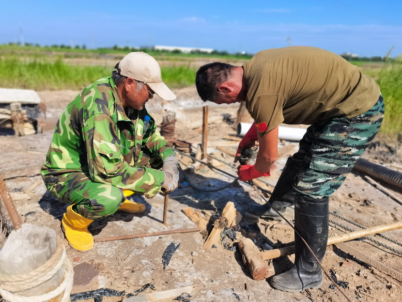 來(lái)到海州灣公司灘頭,遠(yuǎn)遠(yuǎn)望見(jiàn)幾名職工在鹽池里勞作,走近一看,組長(zhǎng)夏軍正帶領(lǐng)一組人整修塑苫池。“我們5點(diǎn)就出來(lái)了,趁早涼,趕緊把塑料布整理一下,布子上都是鹵,長(zhǎng)了鹽就不好處理了,搞不好這鹵水還會(huì)淌到外面去,造成浪費(fèi)......”邊說(shuō)著邊用肩膀頭子蹭一下眼角的汗水,手里的活一直沒(méi)停。據(jù)了解,海州灣公司承接臺(tái)北礦鹽和鈣液兩大產(chǎn)業(yè),經(jīng)濟(jì)比重占全公司收入60-70%,當(dāng)前雖然是高溫期,但是廣大職工搶抓汛期難得的晴好天時(shí),每天清晨5點(diǎn)就在灘地上忙碌起來(lái),汗水模糊了雙眼,額頭的汗水順著帽檐往下滴落,身上的衣服一直都是濕漉漉的,緊貼在身上,即便如此,他們也毫不在意,用他們的話:“看著池子里每時(shí)每刻都在落鹽,這點(diǎn)汗就沒(méi)白淌啊!”我們臨走的時(shí)候,夏軍還不忘說(shuō):“今年我們保證鹽量突破2萬(wàn)噸,不虧損。”