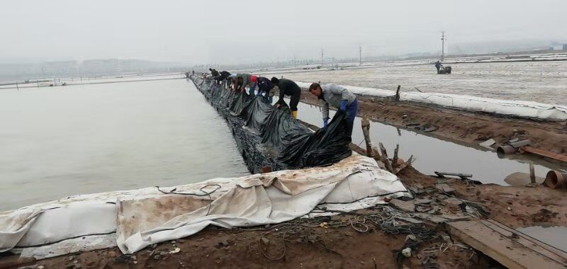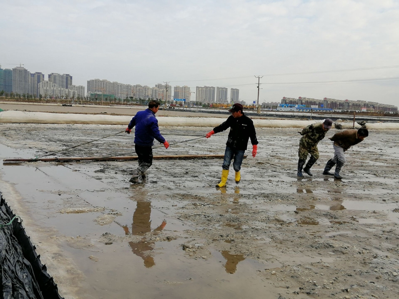 由于勞動力較為缺乏,人工扒鹽分為兩個班次白班和小夜班。工人們在完成各自班次任務的同時,還要承擔起后期繁瑣的相關工作。例如:扒鹽前要將塑池內(nèi)的塑布整理、收縮到位、用活碴機對準備要扒格塊進行活碴、成廩后對鹽廩全面覆蓋、并抽出專人對大夜班空檔期電纜線及機電設備進行看管等等。其中池板整理是一項緊急活,扒完鹽后鹵水要緊跟著進池,小夜班的人下班后有時只睡幾個小時,早上7點多就來到灘頭整理池板,為抓緊灌池爭分奪秒爭。