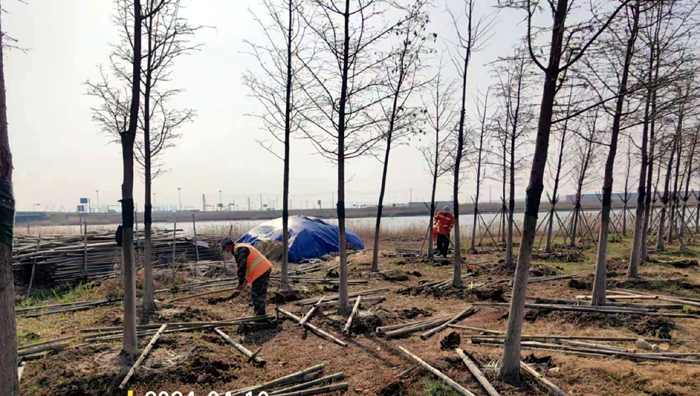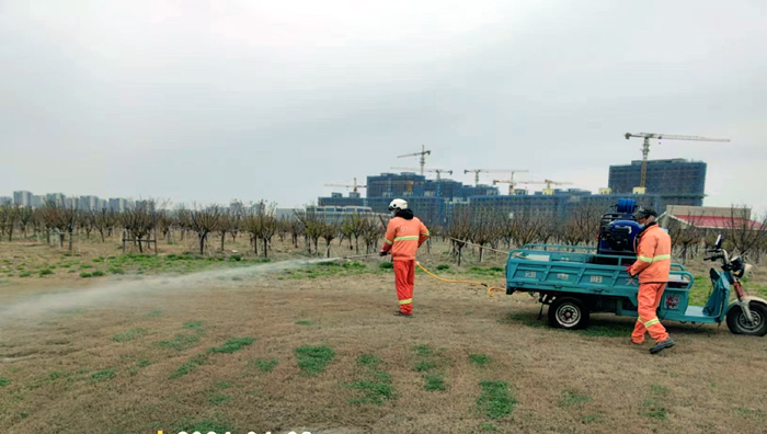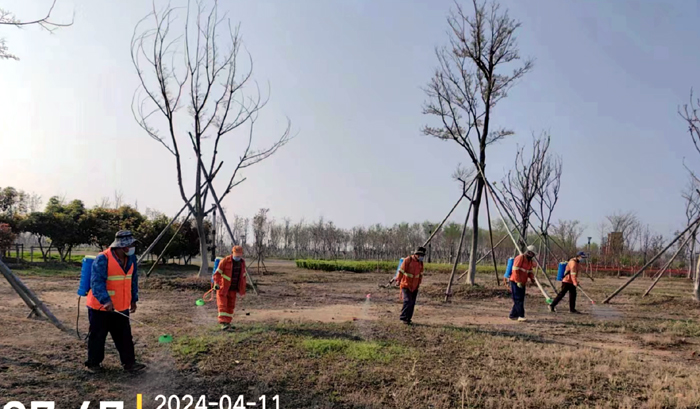 積極澆灌返青水。當前,地溫回升快,苗木易萌芽,該班組采用“人工+機械”相結(jié)合的方式,全面啟動返青水集中澆灌工作,重點對園區(qū)喬木、果木、草坪等進行全面灌溉,促進苗木、草坪返青發(fā)芽。按照分種類、合理澆灌的原則,采取集中澆灌的方式最大限度減緩晝夜溫差對綠化植物的影響,入春后共澆水100余次,對落羽杉圓動力灌根2000棵,對大樹澆水1500棵,綠化澆水約30000平方米。