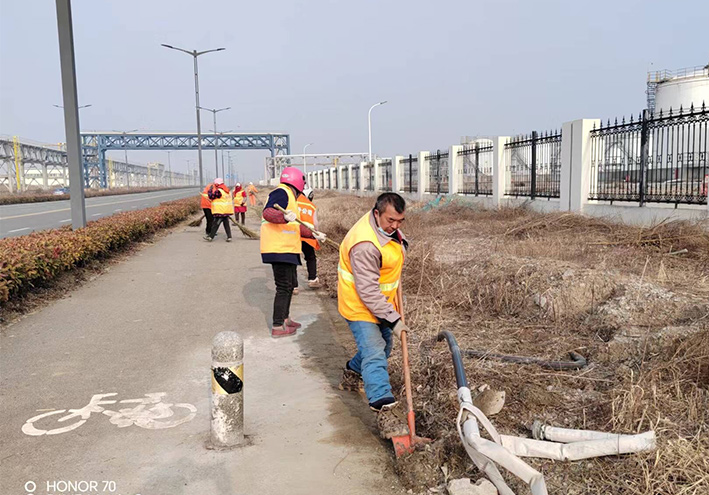 該分公司注重細節(jié),不斷強化突擊治理成效,第一時間策劃保潔方案。園區(qū)兩個班組35名保潔員工在公司統(tǒng)一指揮下,步調一致,無懼三九嚴寒低溫天氣,兩人一對,三人一組,舞動掃把,清掃輔道泥土雜草;勞動現場,黨員先鋒無處不在,石峰、朱海勇、楊靜等同志,身背幾十斤重打草機械,盡管汗水浸濕橙色衣衫,累得腰酸背痛,無所怨言,仍然擺動雙臂,經過近三天的努力奮戰(zhàn),收割石化三道、十道、復堆河路牙,輔道雜草3000多米長,清理管廊、取水點隱藏各類白色垃圾400多包,轉運20余車,人工清掃路面2000多米長。